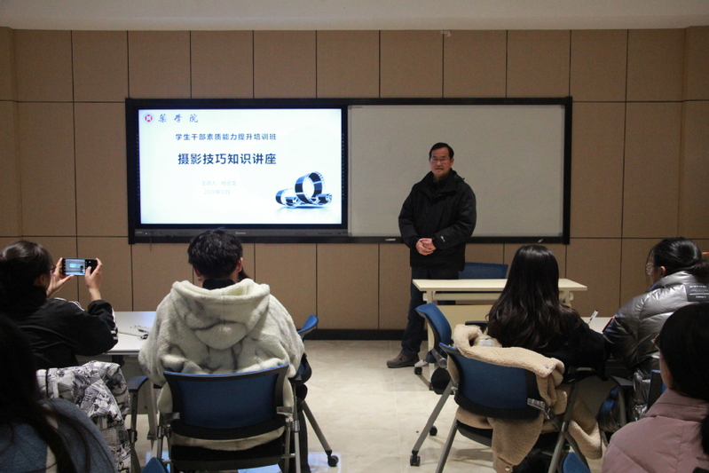 杨金龙老师是中国摄影家协会会员、中国摄影著作权协会会员、国家高级摄影师、江苏省摄影家协会会员、淮安市摄影家协会会员、淮安市无人机协会会员。讲座中杨老师从摄影的基础理论、构图事宜、拍摄经验与技巧、拍摄趣事等方面进行了详细讲解,具体分析活动场景的拍摄方法。从亲自拍摄的白马湖到常盈桥、从大运河到大学城,带领大家走进美轮美奂的摄影世界。杨老师说:“摄影是一门艺术,只有我们留心观察周围事物,才能够找到不同的拍摄角度,才能拍出具有创意性、富有内涵的作品。”并对今后如何提升同学们的摄影技术提出了宝贵的建议。讲座中既有专业知识又有个人经历,现场氛围活跃。