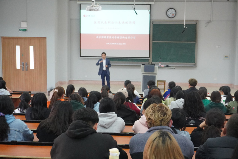 博瑞霖市场总监崔阳、员工杨小敏,针对医药代表的职业及变迁,贴合自己的体验向同学们分享了宝贵的经验;以实际案例向同学们讲述择业定位的重要性,职业观是人生理想在职业问题上的反映,是人生观的重要组成部分,正确的人生观决定正确的职业观。在劳动市场上,每个择业者都自觉或不自觉地以一种职业观指导自己选择职业;同时,还向同学们分享了实用的书籍,鼓励同学们树立终生学习的理念。