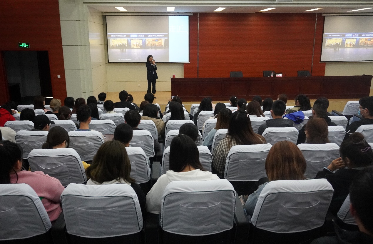 总经理马燕,执业药师、副主任药师,从事药品零售工作二十余年,先后在海王星辰健康药房,老百姓大药房(江苏)公司担任高管,2018年受聘为公司产业教授。马燕老师主讲了《中国医药市场分析报告》,用数据向同学们讲述了国内外零售市场的发展及现状,并对国内头部药房进行了客观分析,使同学们能够客观了解医药流通行业的现状及未来的布局,为同学们下步顶岗实习规划起到了良好的引导作用。
