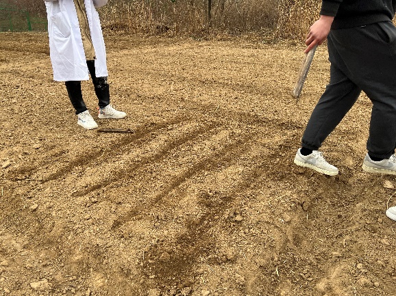 播种组在田间开沟条播,按照20~30cm的间距开行,20cm的间距均匀撒入种子,随即覆土。最后浇水,做好标记即完成了播种任务。